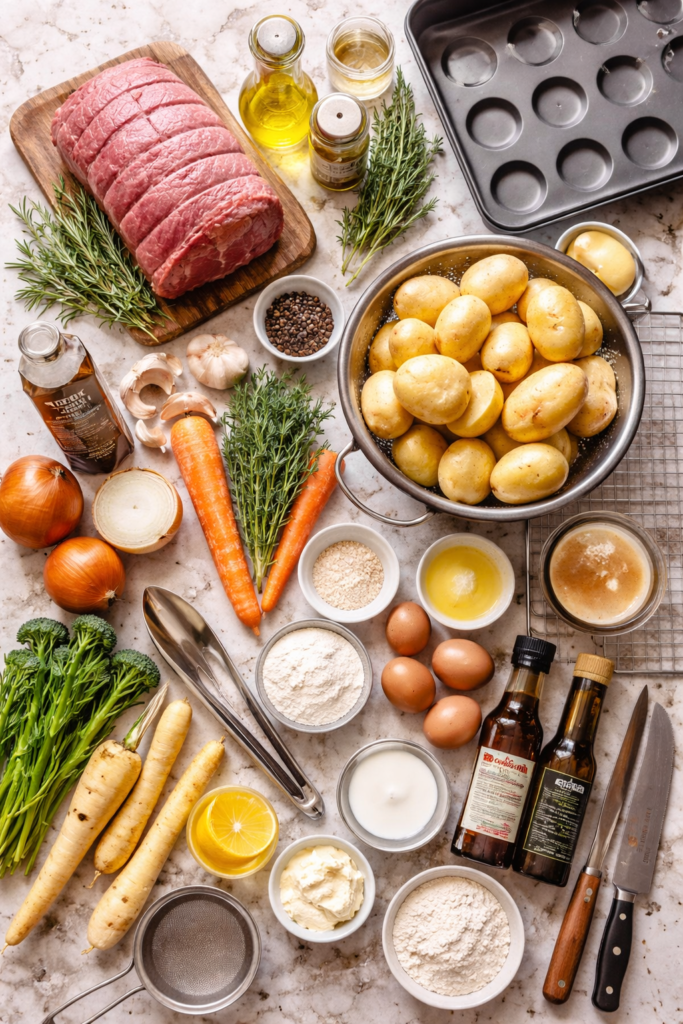 You can have the beef in the oven, potatoes par-boiled, batter rested, and vegetables prepped all within a 30-minute window two hours before serving. Map out the oven temperatures in advance and it all fits together cleanly.