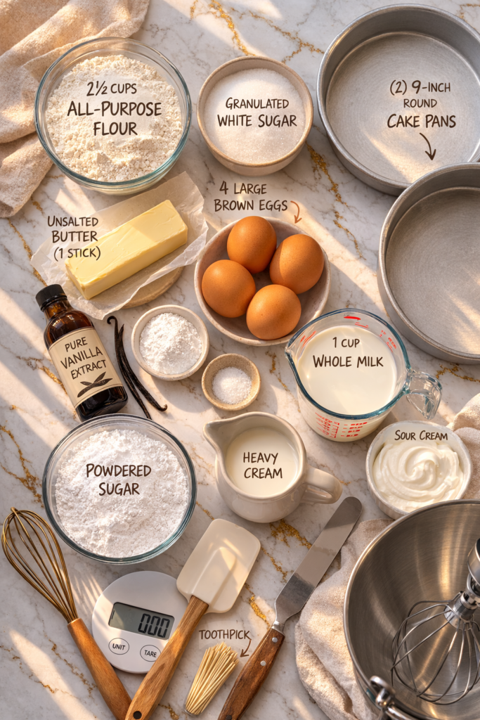 1. Room temperature everything β and I mean everything. Cold butter, cold eggs, cold milk β they don’t mix together properly. The batter can curdle and your layers end up dense. Pull everything out 1 to 2 hours before you start.
